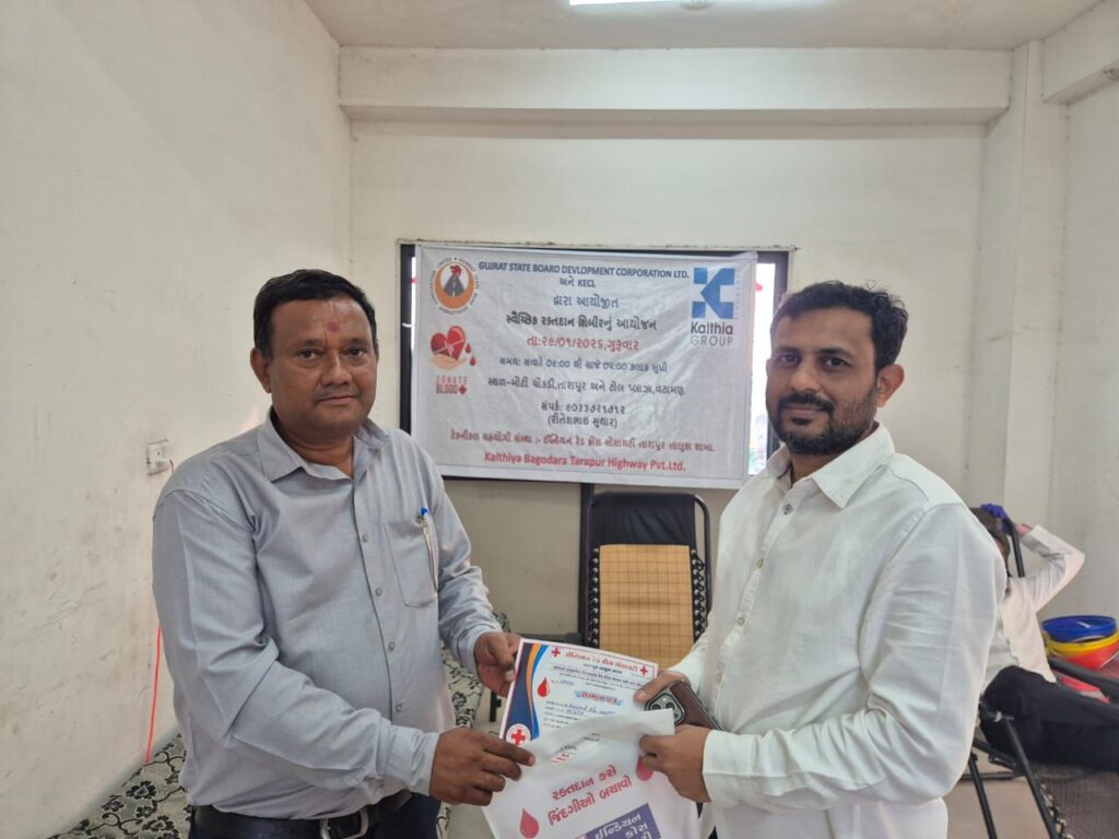 સ્થાનિક નાગરિકોએ આ પહેલને આવકાર આપ્યો અને આવી પ્રવૃત્તિઓ નિયમિત રીતે યોજાય તેવી અપેક્ષા વ્યક્ત કરી. કલથીયા કન્સ્ટ્રકશન અને GSRDC ની આ પહેલ સમાજ માટે એક પ્રેરણાદાયી ઉદાહરણ બની રહી આ કેમ્પ માં RTO નાં સી.વાય. ચૌહાણ, GSRDC નાં ડે, એક્સિકેટિવ એન્જિનિયર પિયુષ ઉપાધ્યાય એ હાજરી આપી હતી અને સમગ્ર કાર્યક્રમ માં રેડ ક્રોસ સોસાયટી અને ઈ. બી. ડી ગૃપ નો સહયોગ રહ્યો હતો….