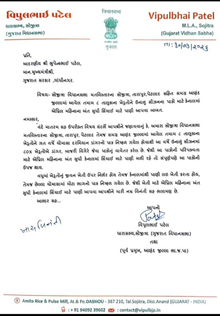ખેડુતોની મુશ્કેલીને ધ્યાનમાં રાખીને સોજીત્રાના ધારાસભ્ય વિપુલ પટેલ દ્વારા રાજ્ય સરકારને પત્ર લખી રજૂઆત કરવામાં આવી હતી. ધારાસભ્યની આ રજૂઆતને સરકારે ગંભીરતાથી લઈને મહી સિંચાઈ વિભાગને જરૂરી સૂચના આપતા મહત્વપૂર્ણ નિર્ણય લેવાયો છે.