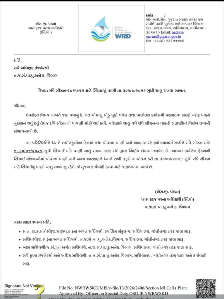 આ નિર્ણય મુજબ હવે 30/04/2026 સુધી કેનાલોમાંથી ખેતી માટે સિંચાઈનું પાણી છોડવામાં આવશે, જેથી ઉનાળુ પાકને પૂરતું પાણી મળી રહે અને ખેડુતોને મોટી રાહત મળે.